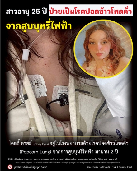 อ้างอิง: https://www.dailymail.co.uk/health/article-14973525/Doctors-thought-young-mom-having-heart-attack-lungs-actually-filling-vape-oil.html