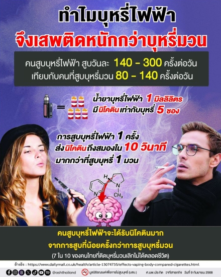 สำหรับแพทย์แล้ว เรื่องที่บุหรี่ไฟฟ้าเสพติดหนักยิ่งกว่าบุหรี่มวน เป็นประเด็นที่น่าห่วงมาก เพราะคนที่ติดบุหรี่มวนที่มารับการรักษากับแพทย์ ยากมากที่จะรักษาให้เลิกได้ถึง 1 ใน 4 ที่เหลือเลิกไม่ได้จนตาย
