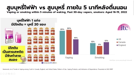 รายงานนี้สอดคล้องกับรายงานที่พบว่า วัยรุ่นแคนาดา สหรัฐอเมริกาและอังกฤษที่สูบบุหรี่ไฟฟ้า มีอัตราที่ต้องสูบบุหรี่ไฟฟ้าภายใน 5 นาทีแรก สูงเป็น 2 เท่าของวัยรุ่นที่สูบบุหรี่มวน ระยะเวลาจากตื่นนอนถึงต้องสูบบุหรี่มวนแรกที่ยิ่งสั้น แสดงว่ายิ่งติดนิโคตินหนัก การเลิกก็จะยิ่งยาก