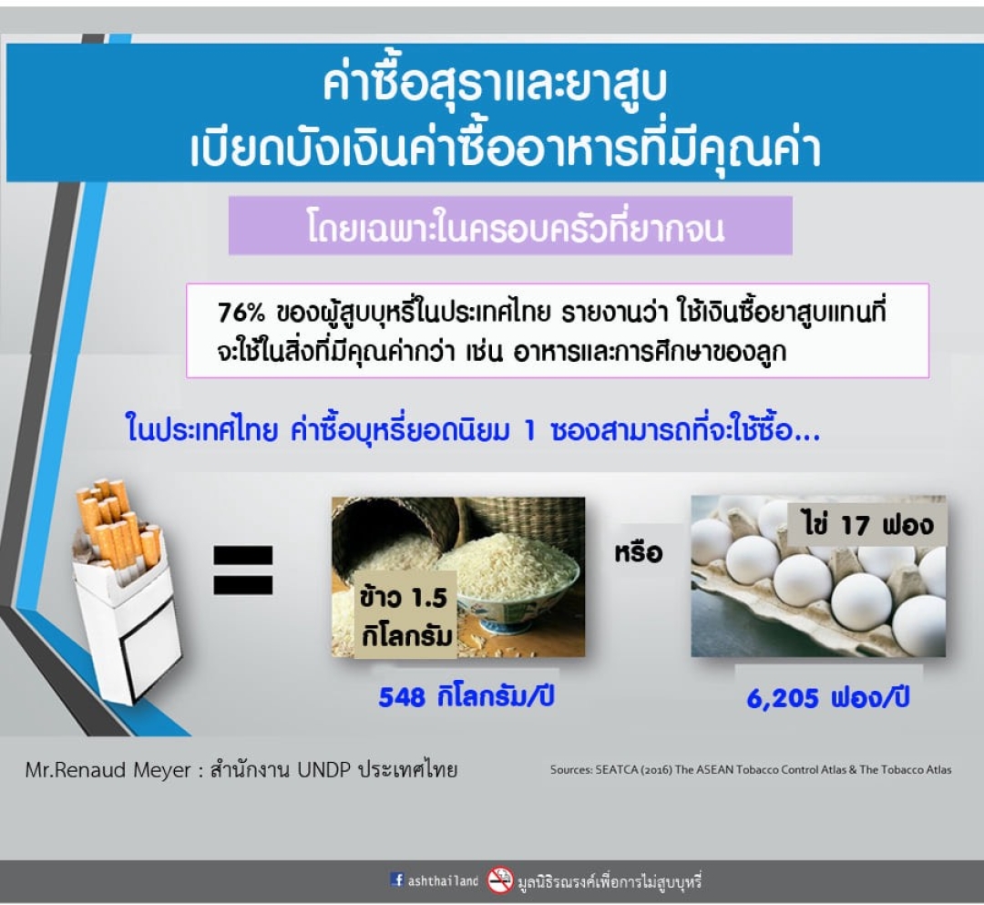 มีคนที่จนที่สุดเกือบ 5 แสนคน ที่มีรายได้เฉลี่ยเดือนละ 1,043 บาท ใช้เงินซื้อบุหรี่มวนเดือนละ 629 บาท คิดเป็น 60% ของรายได้แต่ละเดือน