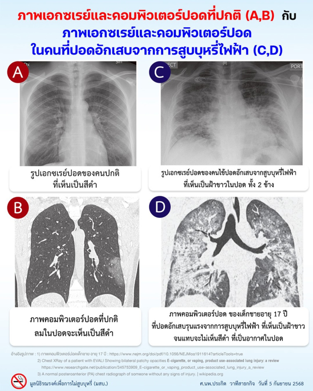 ผมไม่มีรายละเอียดการเจ็บป่วยของเคสนี้ แต่น่าจะสันนิษฐานได้ว่า ผู้ป่วยเป็นเคสปอดอักเสบรุนแรงจากสูบบุหรี่ไฟฟ้า หรือโรคอีวาลี่ EVALI มากที่สุด